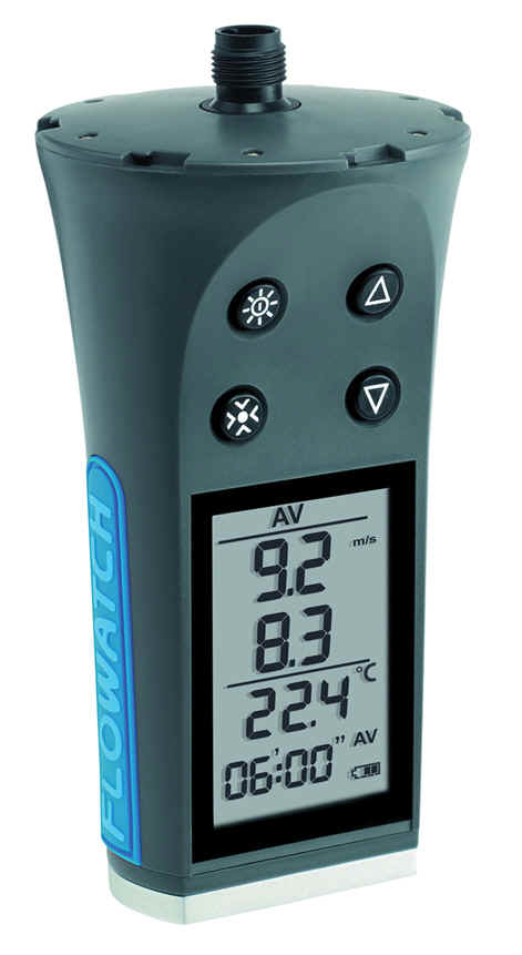 El nuevo Flowatch es a prueba de agua y flota, por lo que es adecuado para mediciones de agua. Es grande y fácil de leer por su gran pantalla LCD y tiene luz de fondo, y la caja tiene una base de aluminio con posibilidad de montaje de un trípode que permite mediciones extendida. El nuevo diseño permite que el instrumento este alimentado por 2 baterías AA, en lugar de una pila de botón.