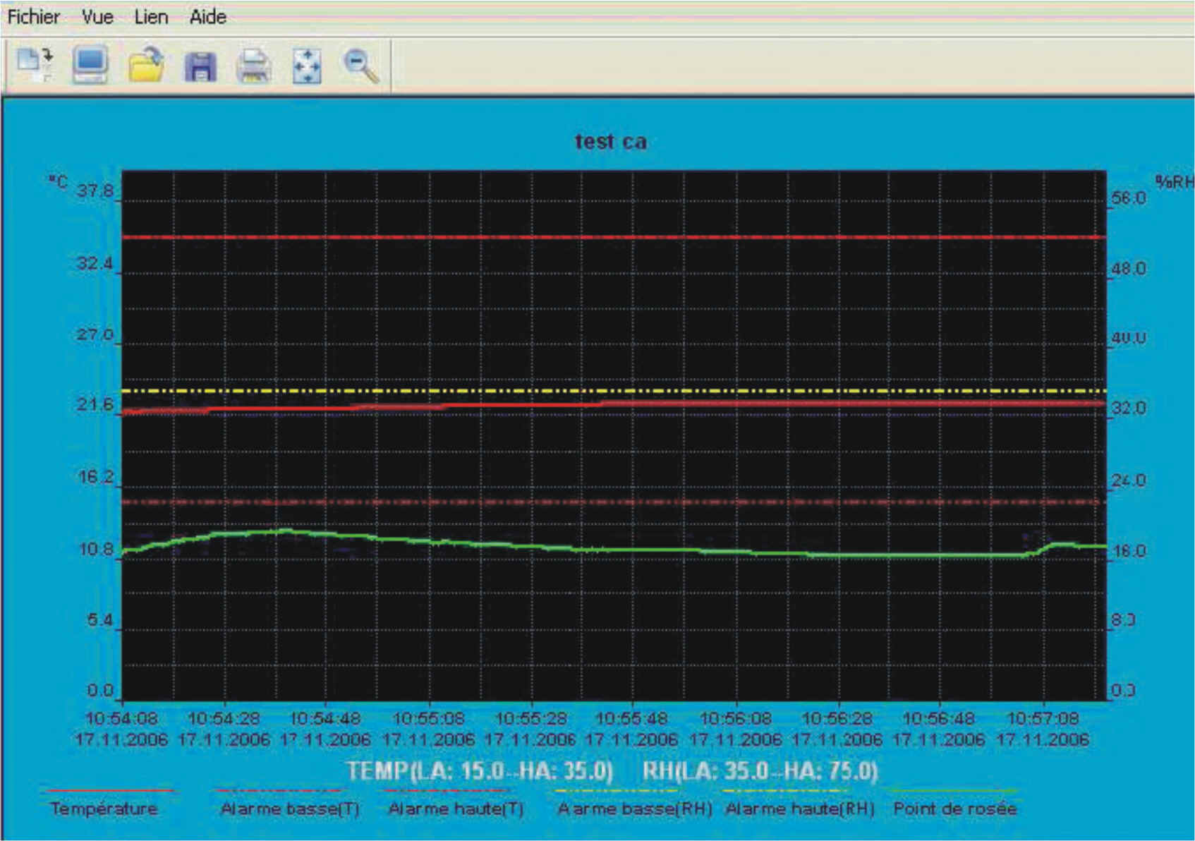 | Se suministra el software en CD: • Para visualizar los datos registrados. • Para configurar las opciones del equipo La ventana Gráfica de las medidas presenta los datos transferidos en un formato gráfico x-y con:la Fecha y Hora representados sobre el eje horizontal y la Temperatura / % d’humedad relativa / Punto de rocío / Umbrales de alarma representados sobre el eje y. |