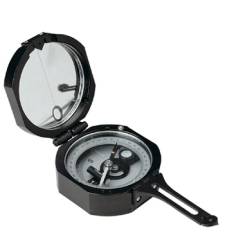 Brújula para Geología – Topografía – Minería etc, tipo BRUNTON con clinometro, con 2 niveles (tubular y circular), caja en resina plástico muy resistente, tapa espejo, alidadas articuladas, tornillo para ajuste de declinación, bloqueo de aguja mediante presión, graduación 1º, precisión +/-0,5º, peso 260 grs, dimensiones 85x73x35mm .