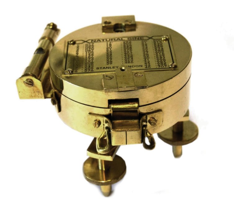 Brújula topográfica en latón macizo con nivel tórico lateral regulable y plataforma con tres tornillos nivelantes. Tapa con espejo y línea vertical como punto de mira Visor con lente de aumento, con tornillo para el ajuste de la declinación, bloqueo de la brújula al cerrar la tapa Diámetro 79 mm Peso 0,680 kg