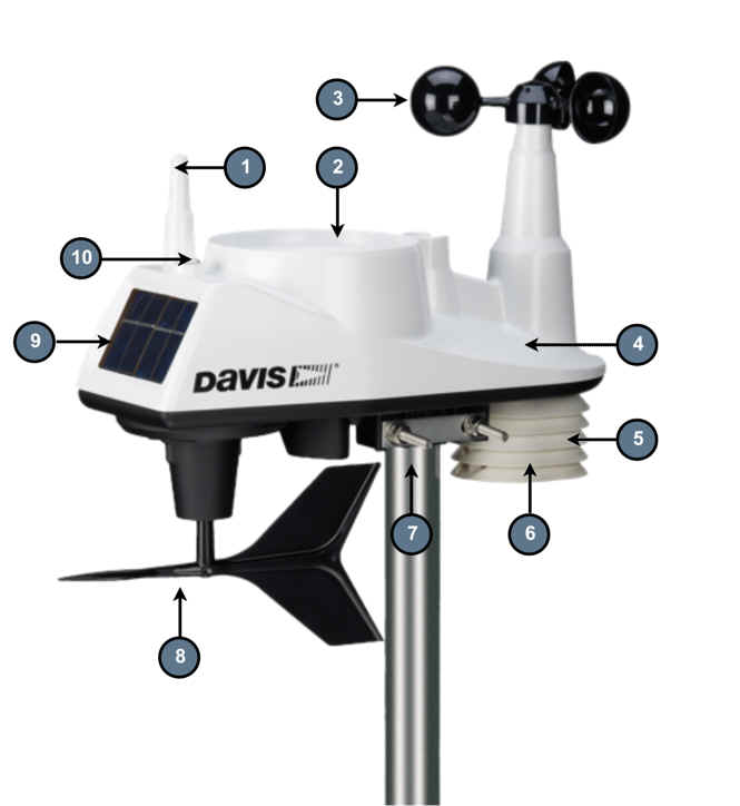 Conjunto de sensores 1) Antena inalámbrica con tecnología radio de espectro ensanchado por salto en frecuencia, que asegura una transmisión de datos fiable hasta a 300 metros. 2) Pluviómetro de cucharilla con auto-vaciado para medir la lluvia con una resolución de 0.2 mm. 3) Anemómetro para medir la velocidad del viento desde 3 km/h hasta 240 km/h, mostrada en kilómetros por hora, millas por hora, metros por segundo y nudos. 4) Carcasa impermeable para proteger los componentes electrónicos ubicados en el interior, contra los elementos. 5) Protector solar que aísla el sensor de temperatura y humedad de la radiación solar y de otras fuentes de calor irradiado y reflejado. 6) Temperatura exterior desde -40ºC hasta 65ºC y humedad relativa desde 0 hasta el 100%. 7) Instalación fácil y rápida con herrajes de montaje incluidos. 8) Dirección del viento en 16 puntos cardinales o en grados. 9) Panel solar para alimentar el conjunto de sensores durante el día. Una batería interna proporciona energía por la noche y una pila de litio sirve de respaldo en caso de necesidad. 10) Nivel de burbuja para una instalación más precisa y una mejor captura de datos. |