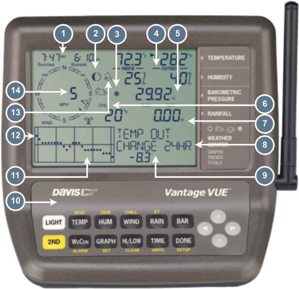 Consola 1) Fecha y hora actual o de salida/puesta de sol. 2) 8 Fases lunares desde luna nueva hasta luna llena. 3) Iconos de previsión para sol, sol parcial, nubes, lluvia y nieve. 4) Temperatura y humedad interior y exterior. 5) Barómetro con 5 vectores que indican si la presión atmosférica está estable, subiendo o bajando. 6) Índices meteorológicos como la sensación térmica o el punto de rocío, entre otros. 7) Lluvia total y promediada cada 20 segundos para las últimas 25 horas, días y meses. 8) Función ‘cambios en el tiempo desde ayer’ para comparar los cambios en la temperatura y en la presión atmosférica en las últimas 24 horas. 9) Weather Center proporciona una completa información adicional sobre cada variable. 10) Teclado cómodo y con retro-iluminación. 11) 50 Gráficos de las últimas 25 horas, días o meses. 12) Función ‘el tiempo ayer’ para facilitar el análisis de las variables meteorológicas día a día. 13) 22 Alarmas simultáneas para alertar de varios peligros como vientos fuertes o temperaturas mínimas. 14) Velocidad del viento instantánea y promediada en 2 y 10 minutos. En mph, km/h, m/s y nudos.