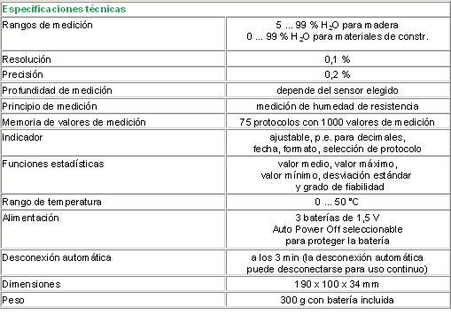 Detector de humedad de materiales de construcción dirigido por un microprocesador que sirve para determinar la humedad absoluta de madera, materiales de construcción y papel. Para hacerlo, el detector de humedad de materiales de construcción posee un electrodo que se pueden introducir en o sobre el material a medir. El aparato corrige el valor de humedad medido en porcentajes reales teniendo en cuenta el material preseleccionado y la temperatura (humedad absoluta). Excepcionalmente en el aparato se encuentran curvas de calibración de numerosos tipos de madera. El propio usuario podrá también programar diez curvas de calibración adicionales en el detector de humedad de materiales de construcción. El HM019 tiene una capacidad de memoria de 75 protocolos con 1000 valores de medición. Cada protocolo contiene indicaciones sobre el material a medir y un resumen estadístico con el rango de fiabilidad (reloj en tiempo real y fecha). Los valores de medición almacenados pueden ser transmitidos al ordenador con el software del envío para su posterior elaboración. Se puede conectar un sensor de temperatura al detector de humedad de materiales de construcción para realizar una corrección de temperatura automática y poder determinar el contenido de humedad de la madera y el papel. El HM019 es utilizado por profesionales que deben realizar controles de calidad de mediciones de humedad de diferentes tipos de madera, papel o materiales de construcción, determinarlos, almacenarlos y valorarlos en el PC. | |