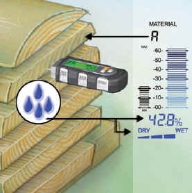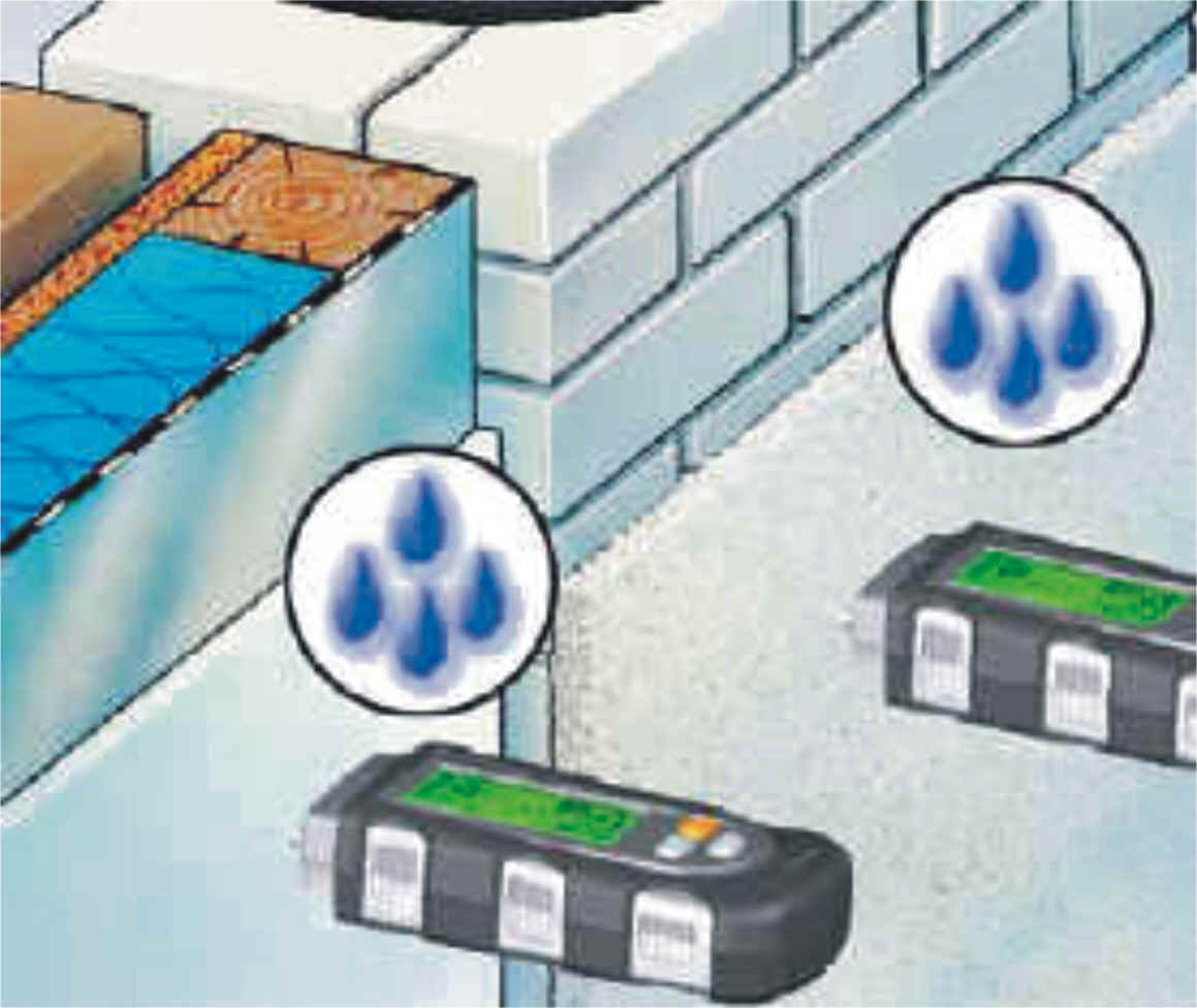 Localización rápida de la humedad: En el modo indicador, a partir de una escala neutra, se realizan mediciones comparativas para determinar si la humedad es creciente o decreciente.