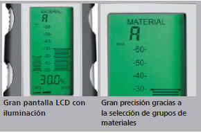 | Todos los resultados de medición de una mirada: toda la información relevante (material, valor de medición, indicación de barras, indicación de húmedo y seco, MIN/MAX) se puede ver simultáneamente en la gran pantalla de cristal líquido iluminada.
