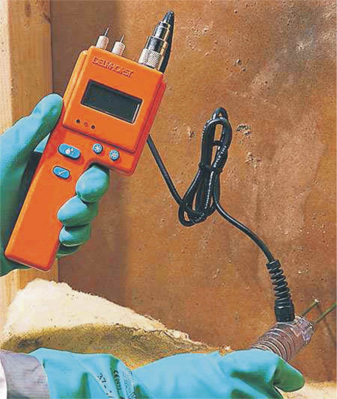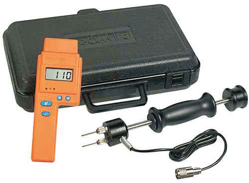 Características y aplicaciones: Display digital con escalas separadas para madera, revocados de yeso /hormigón y derivados del yeso . Medidas del contenido de humedad en madera, rango de 6-40 %. Escala de referencia para lecturas de humedad relativa en los materiales que no son maderas. Acumula un promedio de lecturas de hasta 100 mediciones. Alarma ajustable, la alarma le alerta cuando un % de humedad preseleccionado se ha alcanzado. Los LEDs Verde, amarillo y rojo proporcionan una indicación de las condiciones de humedad con sólo una mirada. Es uno de los equipos favoritos de la industria para las puebas de EIFS (aislamientos).