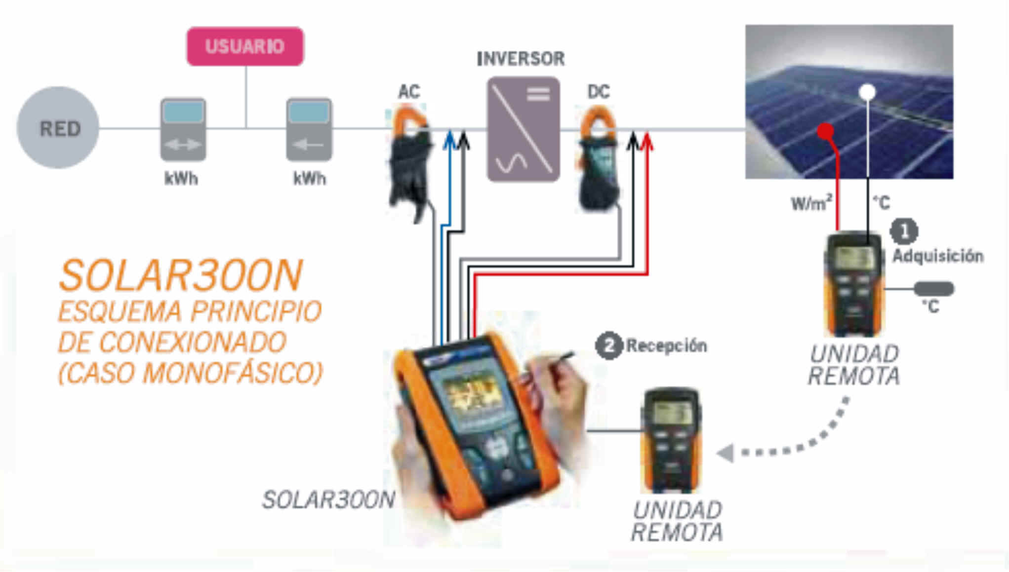 | • Medida Tensión CC/CA TRMS (Monofásico y Trifásico) • Medida Corriente CC/CA TRMS (Monofásico y Trifásico) • Medida Potencia CC/CA (Monofásico y Trifásico) • Medida Energía CA (Monofásico y Trifásico) • Medida Factor de potencia (cos•) (Monofásico y Trifásico) • Medida Irradiación solar [W/m2] • Medida Temperatura paneles y ambiental • Valoración resultado conexión: OK / NO OK • Registro armónicos de tensión y corriente hasta el 49º • Registro anomalías de tensión (huecos, picos) • Análisis de Flicker en acuerdo a la EN50160 • Registro corriente de arranque con resolución 10mseg. • Registro Spikes de tensión con resolución 5µseg. • Análisis completo calidad de red según EN50160 • Visualización numérica y gráfica de cada parámetro • Rellamada resultados en el visualizador • Visualizador TFT a color con “pantalla táctil” • Alimentación con batería recargable Li-ION • Expansión de memoria con Compact Flash externa • Inserción de Pen drive USB externo • Salida USB para conexión a PC • Ayuda en línea sobre el visualizador • Incluye pinzas de 100A |