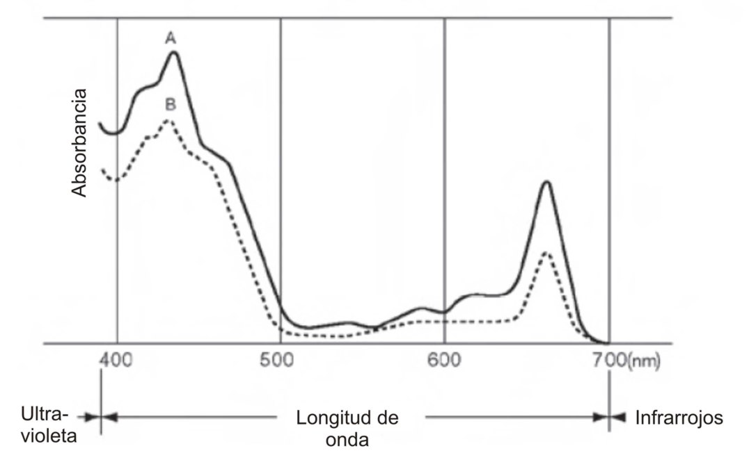 El SPAD-502Plus determina la cantidad relativa de clorofila presente en la medición de la absorbancia de la hoja en dos regiones de longitud de onda. El siguiente gráfico muestra la absorción espectral de la clorofila extraídos de dos muestras de hojas usando acetona 80%. Desde el diagrama, se puede observar que la clorofila tiene picos de absorción en el azul (400-500 nm) y rojo (600-700 nm), las regiones, sin la absorbancia en la región del infrarrojo cercano. Para aprovechar las ventajas características de la clorofila, el SPAD502Plus mide las absorbancias de la hoja en el rojo y el cerca de las regiones infrarroja. Con estas dos absorbancias, el medidor SPAD calculará un valor numérico que es proporcional a la cantidad de la clorofila en la hoja.