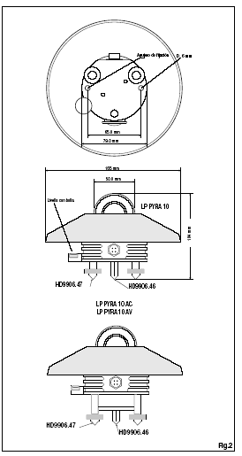 7 Características técnicas Sensibilidad típica: 10 µV/(W/m2) LP PYRA 10 4..20 mA (0-2000 W/m2) LP PYRA 10AC 0..1,5,10V (0-2000 W/m2) LP PYRA 10AV Impedancia: 500 Ω ÷ 1000 Ω Campo de medida: 0-2000 W/m2 Campo de vista: 2π sr Campo espectral: 305 nm ÷ 2800 nm (50%) (trasmisión de las cúpulas) 335 nm ÷ 2200 nm (95%) Temperatura de trabajo: -40 °C ÷ 80 °C Dimensiones: Figura 1 Peso: 0,90 Kg