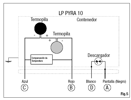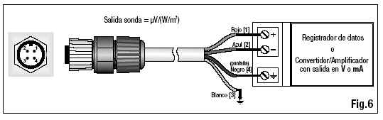 | El LP PYRA 10 debe ser conectado a un milivoltímetro o a un sistema de adqui-sición de datos. Por lo general, la señal de salida del piranómetro no excede los 20 mV. La resolución recomendada del instrumento de lectura del con el fin de aprovechar al máximo las características del piranómetro, es de 1 µV. |