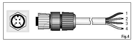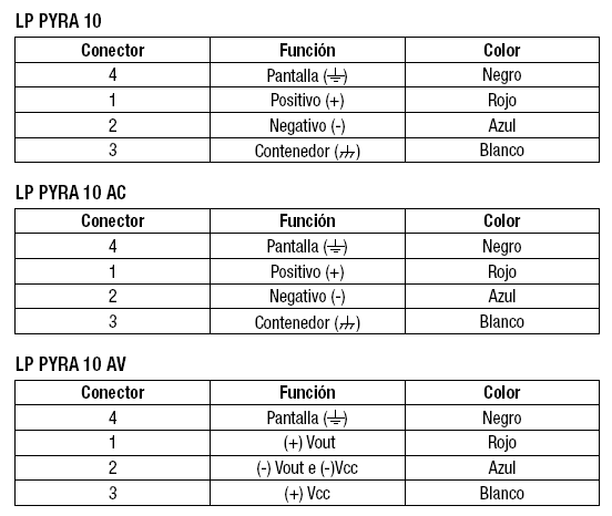 | 4 Conexiones eléctricas y requisitos de la electrónica de lecturaEl LP PYRA 10 se realiza en tres versiones: LP PYRA 10, LP PYRA 10 AC y LP PYRA 10 AV • La versión LP PYRA 10 es pasiva y no debe ser alimentada. • Las versiones LP PYRA 10 AC,AV son activas y deben ser alimentadas. La tensión requerida es de 8-30 VDC para las versiones LP PYRA 10 AC y LP PYRA 10 AV con salida 0..1V e 0..5 V. 14-30 VDC para la versión LP PYRA 10 AV con salida 0..10V.• Todas las versiones tienen un conector de salida de 4 poles. • El cable opcional, que acaba en una extremidad con el colector, es en PTFE resi-stente a los UV. Tiene 3 alambres más la unión (pantalla). La correspondencia entre los colores del cable y los poles del conector es la que sigue (Figura 4): |
