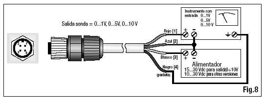 | El LP PYRA 10 AV debe ser conectado a un alimentador y a un multímetro según el siguiente esquema (Figura 8), la resistencia de carga para la lectura de la señal debe ser ≥ 100 KΩ: |