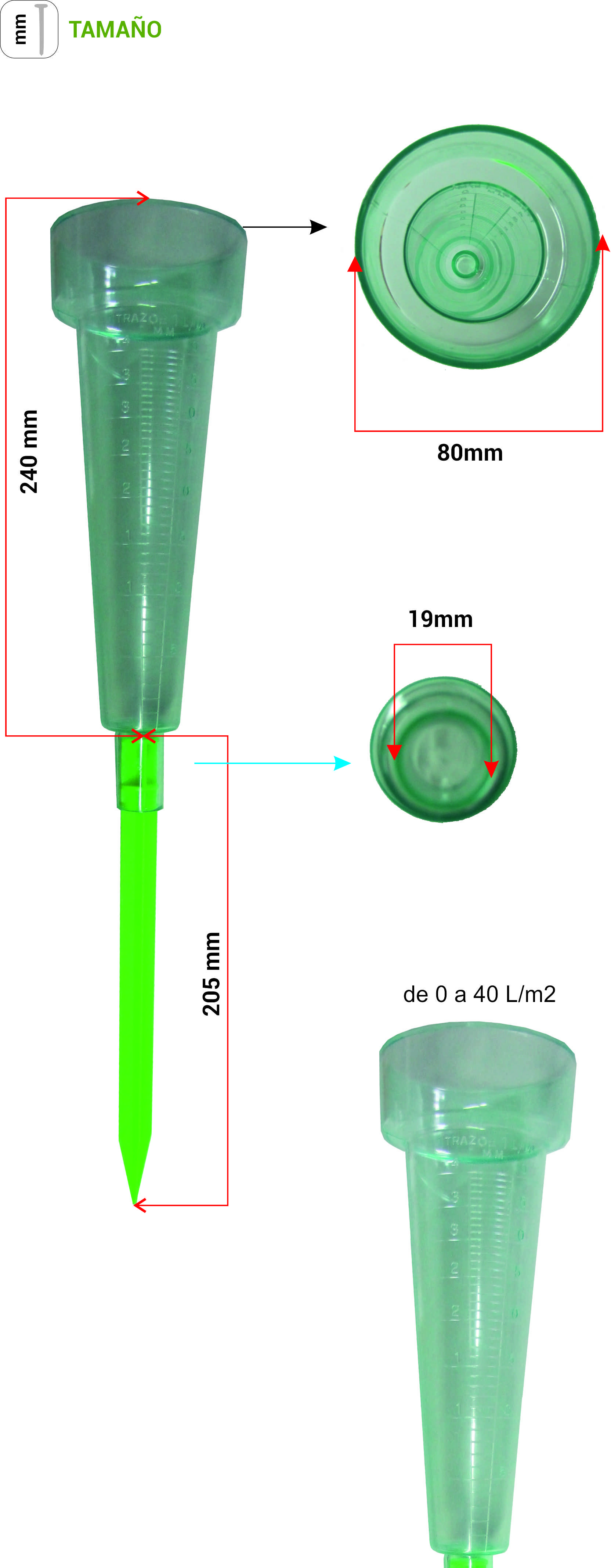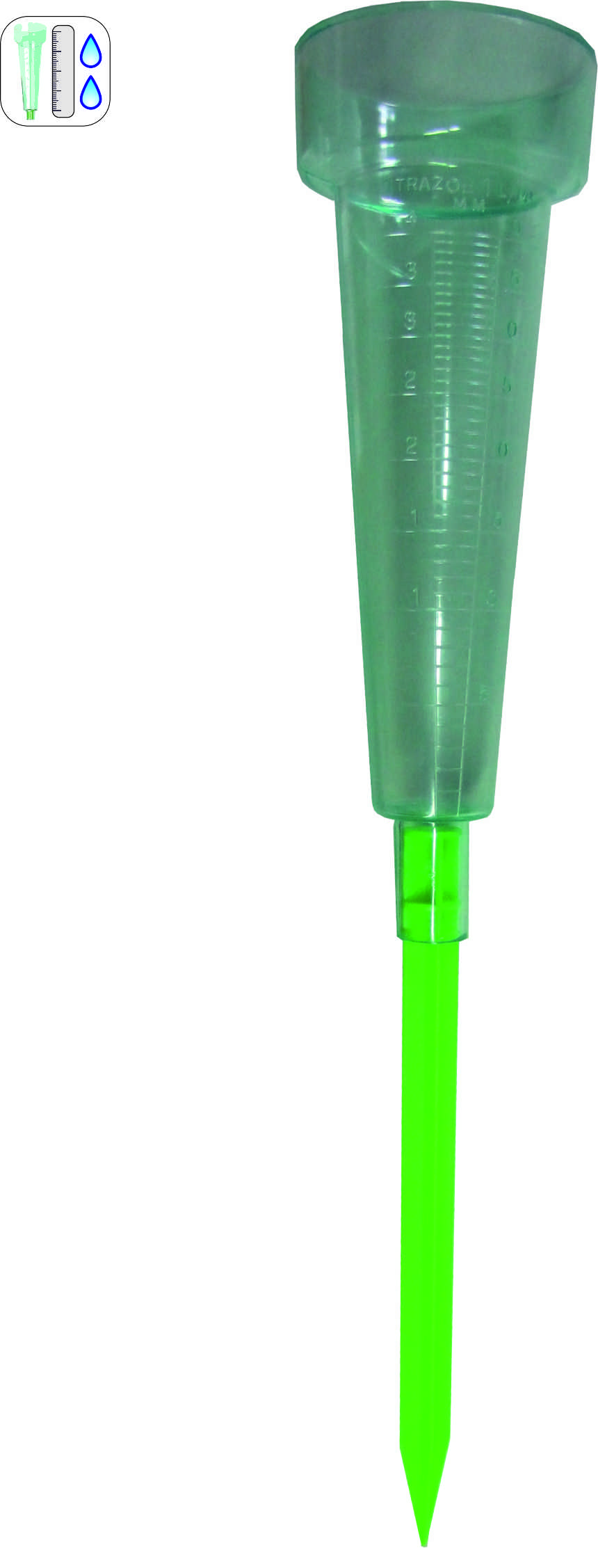 Pluviómetro PV001 de plástico de 40 litros, incluye piqueta para clavar en la tierra. Tamaño 80mm de diámetro x235 mm de largo