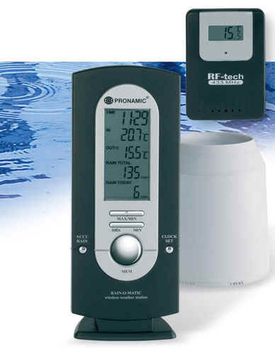 Después de cada milímetro de lluvia, la cucharilla se vacía y en la pantalla LCD se muestra la lluvia acumulada. El pluviómetro está formado por 3 partes: el embudo, la caja principal y la base, las cuales se pueden desmontar fácilmente sin utilizar ninguna herramienta. El embudo mide 5x10cm y la lluvia es registrada con una resolución de 1mm o 1/10 pulgadas. El pluviómetro está fabricado en STYROSUN el cual es un material muy duradero y resistente al agua, a los rayos UV y a las temperaturas más extremas. El sistema patentado de vaciado automático es único y coloca al el PV007A entre los pluviómetros más precisos del mercado. El método de medida es muy preciso y tiene una desviación máxima de +/-2%. El termómetro inalámbrico está diseñado de forma que el sensor para la temperatura interior está dentro de la pantalla LCD y el sensor para la temperatura exterior incorpora su propia pantalla LCD. El termómetro inalámbrico puede medir la temperatura en grados Celsius o Fahrenheit. El termómetro tiene una memoria para registrar la temperatura máxima y mínima dentro del periodo de medida. Rango de temperatura: Temperatura interior: 0 - +50 C +32 F - +122 F Temperatura exterior: -50 - +70 C -58 F - +158 F Con una precisión de +/- 1 C (+/- 1.8 F) La lluvia se almacena en 2 memorias del dispositivo. De esta forma, es posible registrar la lluvia caída en un periodo corto de tiempo como un día, semana o mese y a la vez es posible leer la lluvia total acumulada del año. El dispositivo interior puede ser colgado en una pared o puede colocarse de pie mediante el soporte retráctil posterior. El PV007A funciona con pilas (no incluidas). |