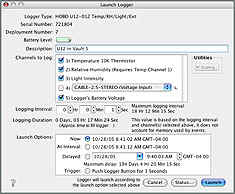 Iniciar las medidas del registrador es fácil por medio de la ventana "Iniciar Logger" del software de HOBOware (se muestra la versión para Mac) Gráficos: • Ver múltiples parámetros de uno varios registradores en una sola gráfica • Combina datos de múltiples registros en una sola gráfica • Datos de superposición de diferentes períodos de tiempo para comparar mes a mes, o antes y después de • Guardar y recuperar los gráficos - guarda todas las modificaciones, incluyendo las series agregado de datos y datos derivados, tales como diarios mínimos y máximos • Zoom y el eje de las herramientas de control para centrarse en los datos de interés • Añadir notas a la gráfica • Herramienta muestra Crosshair valor parcela • Las series de datos de pantalla y detalles como los parámetros de lanzamiento y las estadísticas de la serie • Sume las líneas límite de la gráfica • Ejes de control, serie, la leyenda y las propiedades del título • Pantalla opcional de registrador de eventos tales como Push Button / liberación, conexión a ordenador central, y / o mal de la batería Comprobar el Estado del Registrador • Comprueba la memoria y el estado de la batería • Verifica el funcionamiento del registrador • Visualiza las lecturas de los sensores en tiempo real