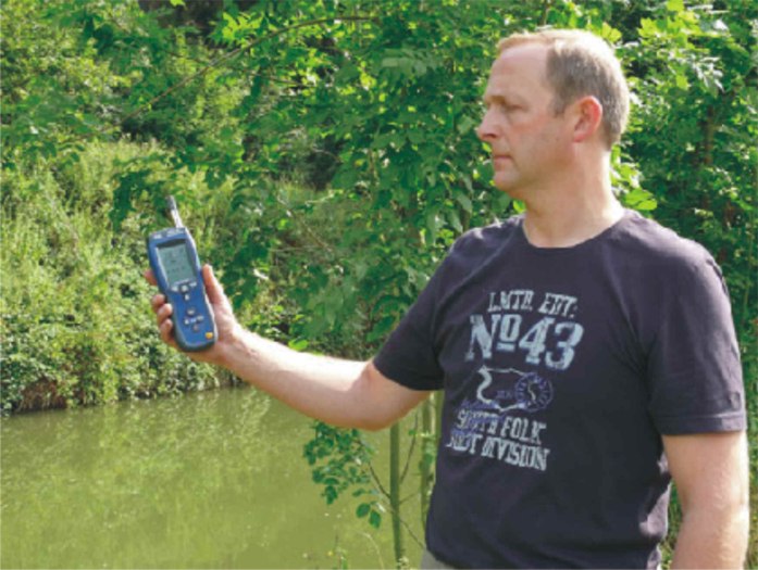 | La imagen superior muestra el higrómetro midiendo una habitación (humedad relativa y temperatura) Con estos dos factores calcula la temperatura del punto de rocío. Adicionalmente se aprecia la medición sin contacto de la temperatura de la pared del higrómetro . Esto le permite averiguar si la temperatura de la pared está por debajo del punto de rocío. En ese caso, se condensaría agua en la pared. Esto es también válido para la valoración de mercancías en cámaras frigoríficas o de productos transportados. Este higrómetro tiene por tanto un amplio ámbito de uso. |