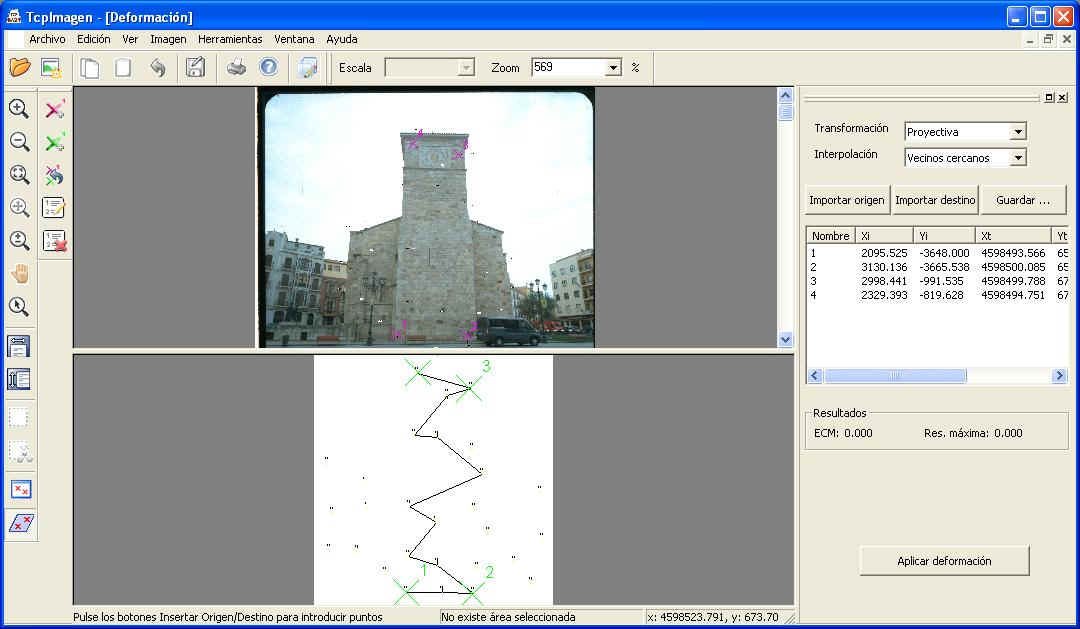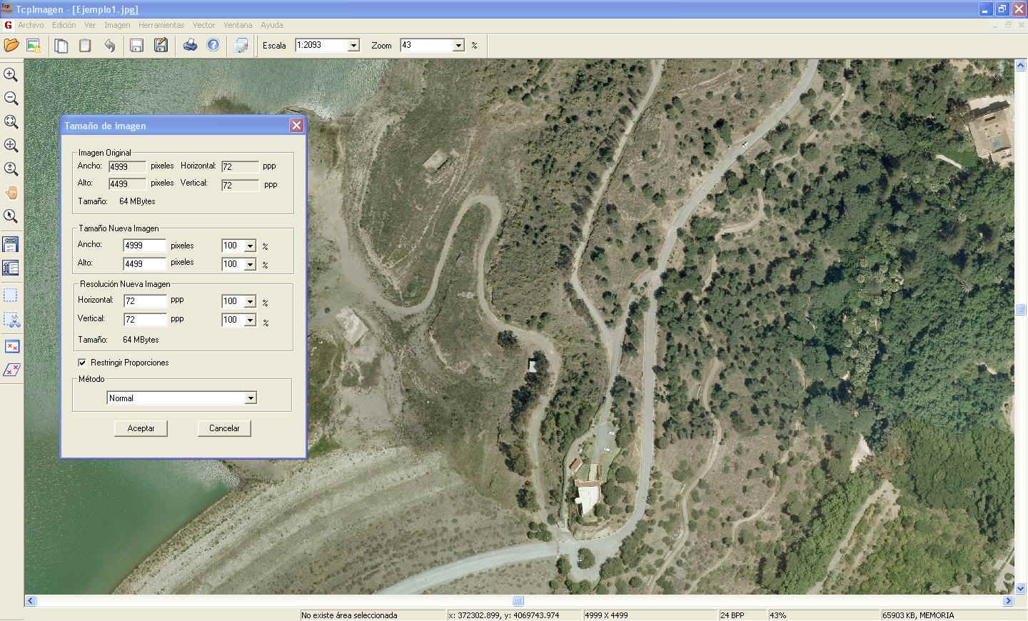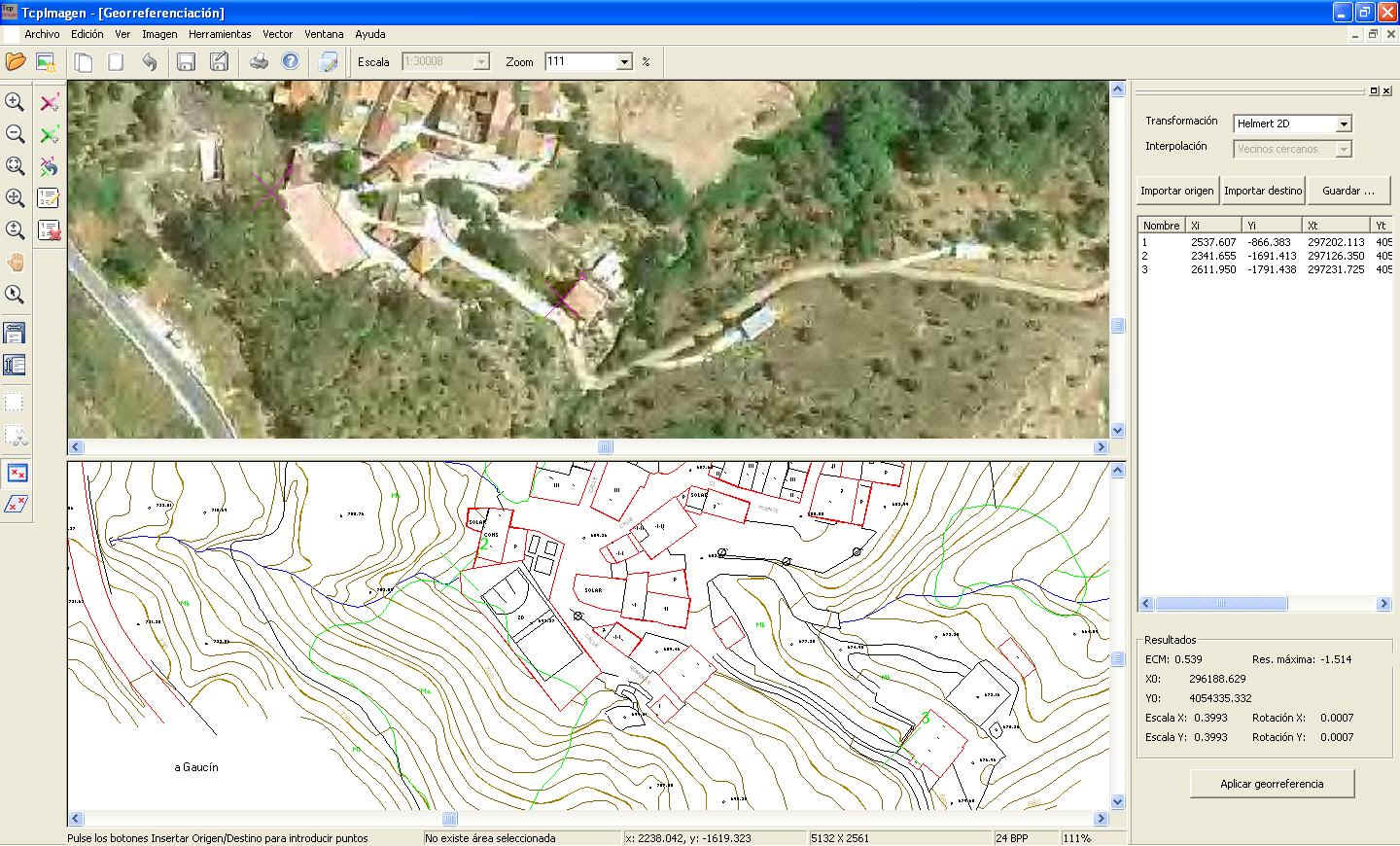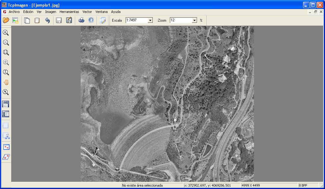 en combinación con dibujos vectoriales. Esta aplicación permite realizar todo tipo de operaciones sobre imágenes digitales, georreferenciadas o no, en una amplia variedad de formatos. Está diseñada especialmente para las necesidades de los proyectos de Topografía, Ingeniería Civil, Arquitectura, Arqueología, etc. en los que resulta frecuente trabajar con fotografías aéreas, ortofotos y mapas escaneados en combinación con dibujos vectoriales. Introducción Esta aplicación permite realizar todo tipo de operaciones sobre imágenes digitales, georreferenciadas o no, en una amplia variedad de formatos. Está diseñada especialmente para las necesidades de los proyectos de Topografía, Ingeniería Civil, Arquitectura, Arqueología, etc. en los que resulta frecuente trabajar con fotografías aéreas, ortofotos y mapas escaneados en combinación con dibujos vectoriales. Su potente interfaz de usuario permite abrir múltiples documentos sobre los que se pueden aplicar diversos controles de visualización, siendo el manejo fácil e intuitivo. Se puede obtener información detallada de las imágenes, así como imprimirlas con diversos controles. Ajustes sobre Imágenes o Regiones Existen controles para ajustar el brillo, contraste, intensidad, saturación, ajustes gamma y balance de color, pudiendo aplicarse a imágenes completas o regiones. Todos los ajustes se aplican de forma interactiva con visualización previa, pudiendo indicar los parámetros de forma gráfica o numérica. También puede cambiarse de modo a escala de grises o profundidad de color de 8, 24, 16 o 32 bits, usando paleta fija, optimizada o especificada por usuario. El histograma de la imagen también puede consultarse. Operaciones sobre Imágenes Otras operaciones consisten en la aplicación de un giro de 90º, 180º, 270º o bien de un ángulo arbitrario. Las imágenes también pueden voltearse en el eje horizontal o vertical. El tamaño de la imagen puede ser modificado especificando el ancho y alto, la resolución o sus porcentajes relativos a la original, indicando el método de interpolación (normal, remuestreo o bicúbica). Georreferenciación TcpImagen permite georreferenciar una imagen a partir de puntos de coordenadas conocidas o bien usando como referencia un dibujo vectorial. La transformación se calcula por Helmert 2D o afín, mostrando el error cuadrático medio y el error máximo obtenido. La creación de ficheros de georreferencia es totalmente transparente para el usuario, pudiendo suprimirla o recalcularla en cualquier momento. Deformaciones Otra interesante herramienta tiene por objeto deformar una imagen indicando cuatro o más puntos conocidos en origen y destino. Para la deformación utiliza una transformación proyectiva con cuatro métodos posibles de interpolación: vecinos cercanos, bilineal, bicúbica y Lagrange. Herramientas por Lotes En muchas ocasiones es preciso ejecutar una serie de operaciones a un conjunto de imágenes. Las herramientas por lotes de TcpImagen permiten ejecutar las siguientes: - Redimensionar un grupo de imágenes - Renombrar imágenes pudiendo añadir prefijos o sufijos - Convertir un grupo de imágenes a un formato determinado - Pegar en una sola imagen un grupo de imágenes georreferenciadas - Dividir en partes una imagen siguiendo como patrón un dibujo (por ejemplo, un esquema de hojas) - Sistema Operativo - Windows 2000 / XP / Vista / 7 en 32 y 64 bits