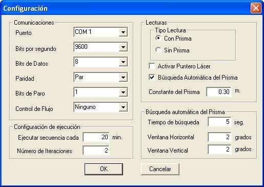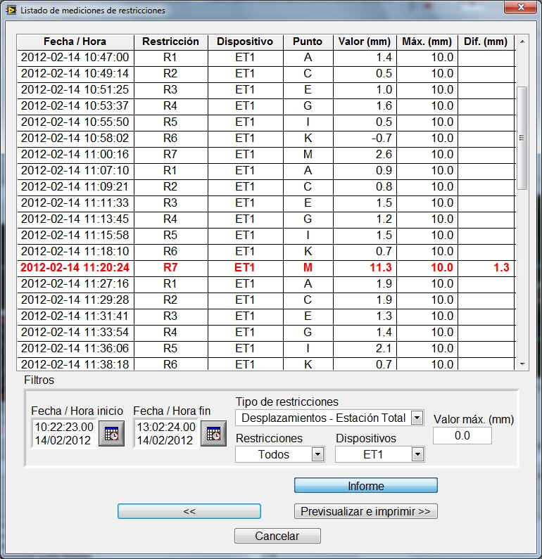 Todos los dispositivos pueden configurarse a través de la aplicación. Por ejemplo, para las estaciones totales se definen los parámetros de comunicación, el modo de lectura, la configuración de la búsqueda automática de prisma, el puntero láser, etc. Opcionalmente se aplican correcciones meteorológicas a las lecturas. Para cada estación total puede programarse la realización de una intersección inversa automática cada cierto tiempo. Para otros dispositivos se establecen asimismo intervalos para su alineación.   Restricciones El programa permite definir diferentes tipos de restricciones para monitorizar los puntos de control. En cada uno de ellos se indican de forma gráfica y numérica el valor actual y los valores máximos admisibles. Las restricciones pueden ser, entre otras: - Diferencia de cota en un punto- Desplazamiento 2D en un punto