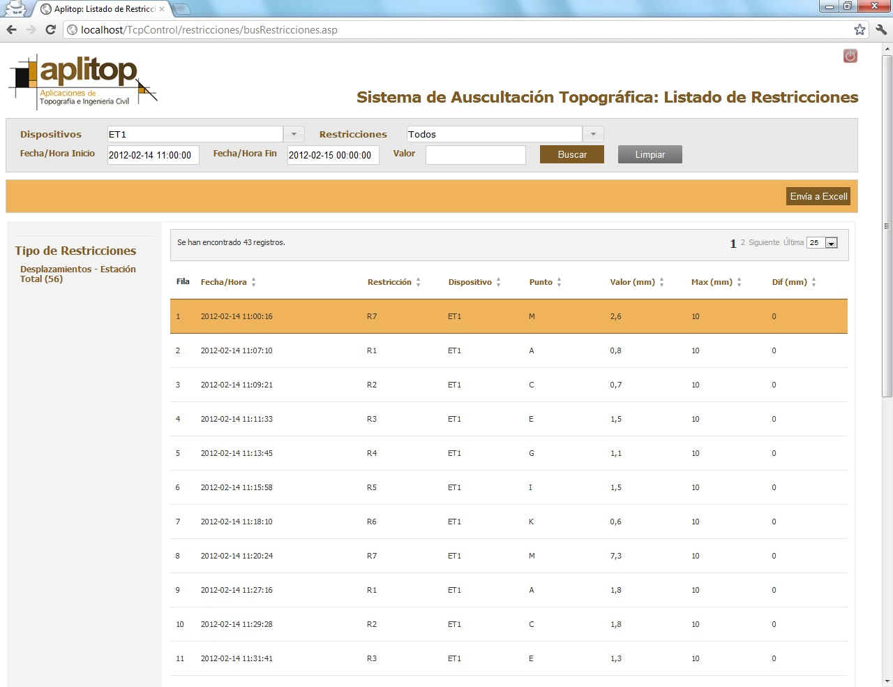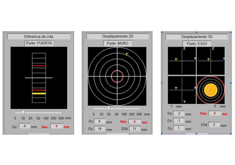 El interfaz de usuario muestra claramente la información necesaria para monitorizar el proyecto. Está dividido en varias regiones: Dispositivos. Se muestra en todo momento el estado de los dispositivos mediante un led de color (verde si es correcto, amarillo si se ha producido alguna incidencia o rojo si hay errores graves en el dispositivo). Además se muestra la acción que está realizando (por ejemplo, posicionando la estación, buscando el prisma, midiendo un punto, etc.). Alertas. Se muestran los errores y advertencias que se han producido, indicando el dispositivo en el que ocurren, la fecha y hora y tipo de error. Además un indicador global muestra el estado general, mostrando de forma intuitiva si ha habido alguna anomalía. Restricciones. Se indican gráfica y numéricamente el estado de las restricciones definidas en el proyecto, indicando los valores actuales y máximos. Pueden mostrarse hasta dos simultáneamente, si bien se permite seleccionar de entre las posibles en cualquier momento. Histórico. Se representa una gráfica con la evolución de los diferentes indicadores, pudiendo seleccionar el rango de representación (minutos, horas, días o meses), la escala y la simbología a emplear. Mensajes. En esta área se muestran todos los mensajes sobre la actividad de la aplicación, mostrando fecha y hora y permitiendo buscar palabras clave. Datos Meteorológicos. Se muestran los datos actuales de temperatura, presión atmosférica, velocidad y dirección del viento, si se cuenta con los dispositivos apropiados. Los datos meteorológicos también son registrados en la base de datos.   Registro de Datos Toda la información sobre las observaciones, valores de las restricciones, mensajes y alertas se graban en una base de datos estándar SQL Server. A partir de una serie de vistas predefinidas y de su modelo de datos documentado permite el análisis de estos datos con herramientas externas. La aplicación permite detener, pausar y reanudar la grabación de datos en cualquier momento, así como realizar copias de seguridad y exportar observaciones y coordenadas a otros formatos comerciales. Alertas