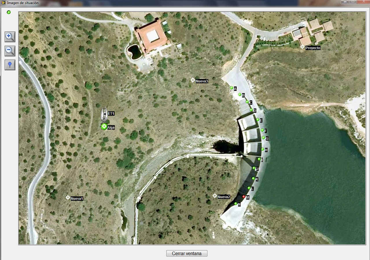 Todos los dispositivos y puntos se sitúan automáticamente en sus coordenadas sobre una ortofoto, o bien pueden ser ubicados manualmente sobre una fotografía o esquema. El color de cada elemento del mapa se actualiza en función de su estado, permitiendo ubicar rápidamente anomalías de funcionamiento o alarmas de medición. Asimismo pueden definirse secuencias de observación de puntos, especificando las horas de inicio y finalización, el intervalo de entre medidas, el número de repeticiones para cada lectura, etc. Un mismo punto puede ser observado por varios dispositivos. Con estos datos el funcionamiento puede ser totalmente automático, dejando el ordenador en modo desatendido.   Dispositivos
