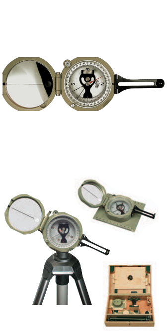 | Brújula Geológica Universal (tipo Brunton) BREITHAUPT "COBRU" Tipo Brunton, para levantamientos geológicos y topográficos. Caja de metal ligero con charnela ajustable; limbo graduado 63 mm Ø, graduación 1/1° (1/1g), numeración cada 10° (10g) en el sentido contrario de las agujas del reloj; declinación ajustable +/-30°, aguja magnética 50 mm de largo con peso de inclinación ajustable; puntos cardinales internacionales (Este y Oeste cambiados); eclímetro ajustable mediante el nivel +/- 90° (100g); dispositivo de bloqueo para la aguja, espejo en la tapa con charnela ajustable y dioptra rebatible; como también provisto de un anillo de fijación para accesorios, dimensiones de la brújula cerrada 75x86x34 mm, peso 200 gramos.