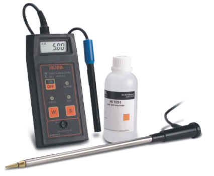 Kit para la medida directa de la conductividad en suelos Es un instrumento específicamente diseñado para la medida directa del suelo y de la conductividad de las soluciones en agricultura. Se suministra completo con dos sondas; de acero inoxidable para mediciones directas de la actividad del terreno y para la medida de la conductividad de las soluciones de regadío. Los dos diferentes rangos de medida(actividad y conductividad) se seleccionan apretando las dos teclas ubicadas en la parte frontal del instrumento; dos LEDs luminosos separados indican en que rango se está operando. Además, va equipado con un LED luminoso en calidad de alarma, que se enciende durante la medida directa del suelo a fin de señalar si faltan sustancias nutritivas como el potasio o el nitrógeno. La sonda de acero inoxidable ha sido diseñada especialmente para la medida directa en el suelo: es suficiente clavarla firmemente en el terreno y leer la medida en la pantalla del instrumento. |