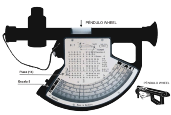 Los sistemas mecánicos y electrónicos están alojados en una carcasa antichoque de material plástico (16). Para efectuar las mediciones el aparato se sujeta en la mano como un pistolete. En posición normal el péndulo está bloqueado, se activa al presionar el pulsador (2). Las oscilaciones del péndulo se observan a través del telescopio (7)en el tambor bloqueador que dispone de referencias negras y amarillas. Al soltar el pulsador (2) se detiene el péndulo y se obtiene el valor de la medición. El sistema electrónico de nivelación se activa presionando el pulsador (25). | |