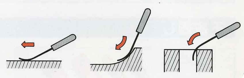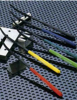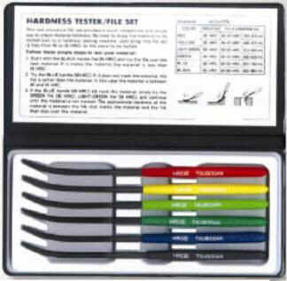 3) Si el filamento AZUL (60 HRC) marca el material, siga con el filamento VERDE (55 HRC), el VERDE CLARO (50 HRC), continuando esta operación hasta que no se marque el material. La dureza aproximada del material se encuentra entre la del último filamento que no marcó y el primero que se deslizó sobre el material sin marcarlo. Cada número indicado tiene una tolerancia de + 2 HRC aproximadamente.