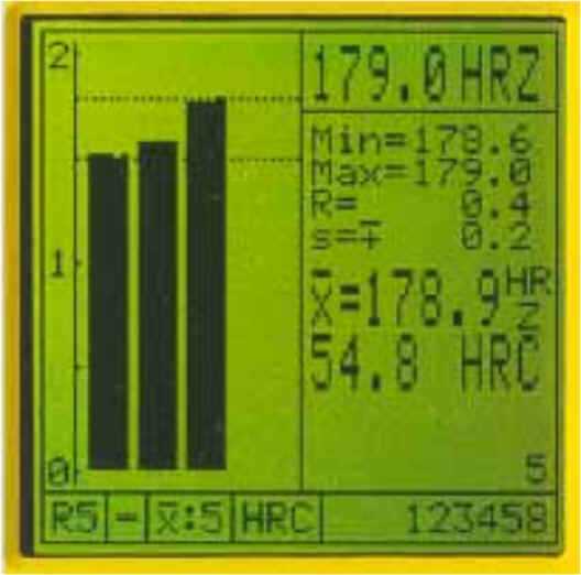 -valor mínimo (min) -valor máximo (max) -diferencia máximo-mínimo ® -desviación estándar (s) -media de valores x HRZ -valor medio convertido -número de impactos -numero de serie de medidas consecutivas La línea informativa indica: Sonda EQUOSTAT R5, corrección por diámetro, selección de número de medidas para valor medio y unidad de medida seleccionada. | |