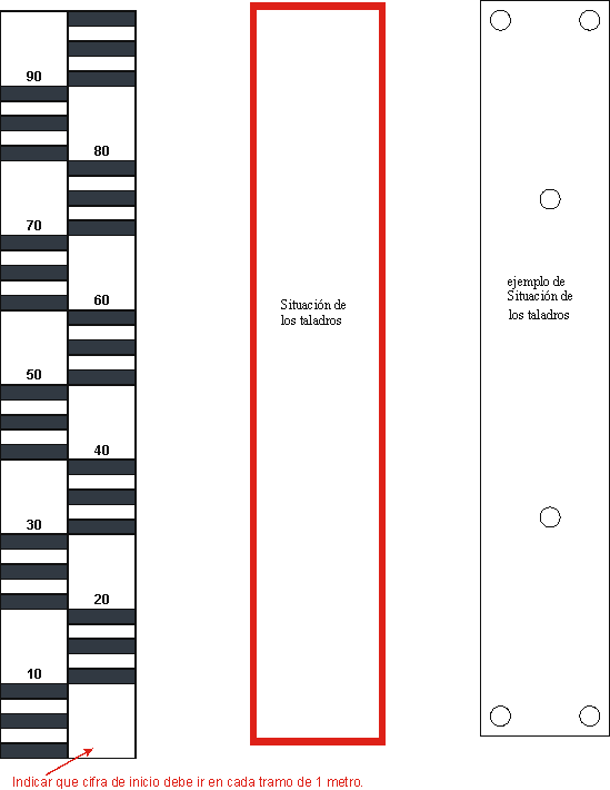 A. Graduaciones. Por favor dibuje a la izquierda las cifras del inicio y del final de las tablillas (como en 9 y 10). Se debe entender que, el espacio para las cifras, abarca la mitad del ancho de la tablilla; esto condiciona la visibilidad de los números. Para 2 o 3 cifras se recomienda el ancho de tablilla de 15 cm o de 12cm. Considerar el grueso del trazo.Posibilidad de tablilla B. Imagen de los orificios (por favor poner una cruz en la opción que interesa) A. Diámetro del taladro 7mm, centrado en el eje B. Orificio ranurado 7x12 mm en el centro C. Orificios en las esquinas, diámetro 7 mm Los orificios se practican en la parta alta de la tablilla, en el centro y en la parte baja. A su deseo se pueden practicar taladros en otras posiciones.