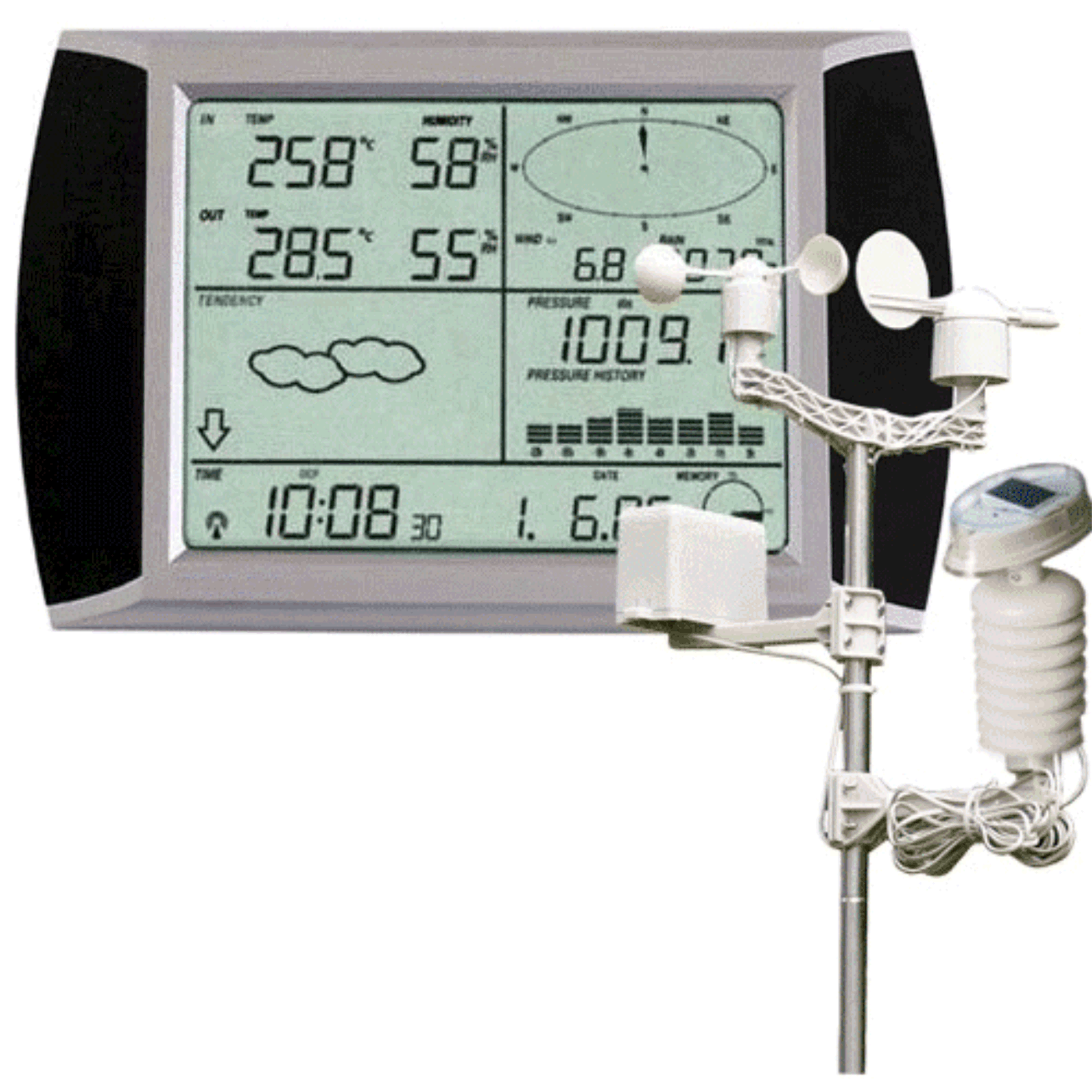 Funciones de la estación base - Temperatura interior en grados Celsius o Fahrenheit - Temperatura exterior en grados Celsius o Fahrenheit - Humedad relativa interior - Humedad relativa exterior - Indicación de la presión atmosférica en inHG o hPa - Selección de presión atmosférica relativa o absoluta - Indicación de la pluviometría en mm o inch - Indicación de la pluviometría para 1 hora, 24 hora, 1 semana, 1 mes o desde la última puesta a cero - Selección de la velocidad del viento en mph, km/h, m/s, nudos o Beaufort - Indicación de la dirección del viento - Indicador de temperatura Wind Chill (sensación térmica) - Indicación del punto de rocío - Previsión del tiempo - Tendencia de la previsión del tiempo - Aviso de tormenta - Indicación de los valores meteorológicos - Funciones de alarma programables para diferentes valores meteorológicos - Memoriza los valores máximo y mínimo recibidos - Pantalla LED con iluminación de fondo - Reloj por radio - Indicación en 12 o 24 horas - Calendario - Ajuste de la franja horaria - Función de ahorro energético - Posibilidad de montarlo en la pared o instalarlo de pie - Ajuste permanente de los valores meteorológicos y el reloj por radio Contenido del envío 1 x estación base con pantalla táctil, 1 x sensor de temperatura con soporte, 1 x sensor de humedad con soporte, 1 x módulo solar 1 x sensor de pluviometría con soporte, 1 x sensor de velocidad del aire con soporte, 1 x sensor de dirección del viento con soporte, 1 x mástil, 1 x cable de conexión USB, 1 x software de análisis, instrucciones de uso. Atención: Las baterías no se incluyen en el envío Esta estación meteorológica es un equipo multifuncional que cubrirá sus expectativas. Tanto en el ámbito privado y el profesional, esta estación meteorológica le fascinará. Esta estación meteorológica le permite detectar de forma precisa la dirección del viento, la velocidad del viento, la temperatura, la humedad relativa y la pluviosidad. Esta es sólo una pequeña selección de las prestaciones que ofrece esta estación meteorológica. Además tiene la posibilidad de activar diferentes funciones de alarma en la estación meteorológica (velocidad del aire, presión atmosférica, etc.). Con la ayuda de esta estación meteorológica podrá decidir entre otras cosas, que clase de ropa sería apropiada ponerse, o si debe regar el jardín o no, y mucho más. Los valores meteorológicos se envían por radio a la base a una distancia máxima de 100 metros. Esta estación meteorológica está equipada con la última tecnología en el análisis meteorológico. La pantalla táctil le permite recuperar de forma muy sencilla los valores de la estación meteorológica. El transmisor es alimentado por un módulo solar y dos pilas recargables. El puerto USB, que incluye el cable USB, le permite transmitir los datos de la estación meteorológica a su PC o portátil.