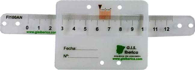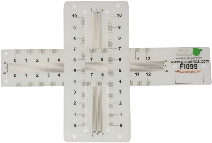 FI125 Fisurómetro transparente fabricado en Planchas de acrílico impactado Slickers con distintas graduaciones para verificar anchos de fisuras por comparación. Rango medición de fisuras de 0,1 mm a 2,3 mm, con intervalo de 0,05,(entre 0,1 y 10 mm), intervalo de 0,1 mm (entre 1 mm y 3 mm). Con medidor central de abertura de fisuras de 2 a 20 mm en intervalos de 1 mm. Incluye regla en mm de 0-110 mm. Tamaño 115 x 54 mm |