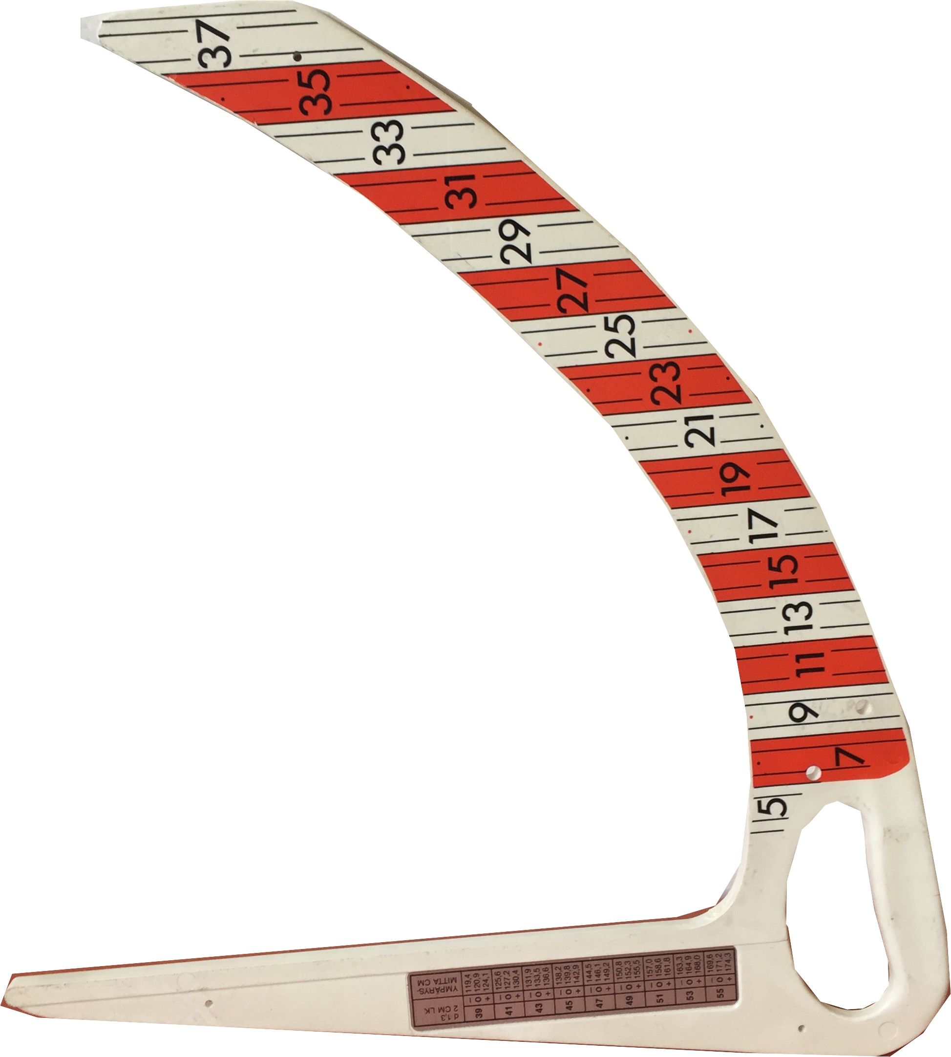 Escala métrica, tiene como división mínima el centímetro, diferenciado en bandas con números grandes. Las graduaciones son paralelas al borde interior del brazo recto. Se usa habitualmente para la medida de diámetros del árbol a distintas alturas con auxilio de pértiga telescópica (opcional).
