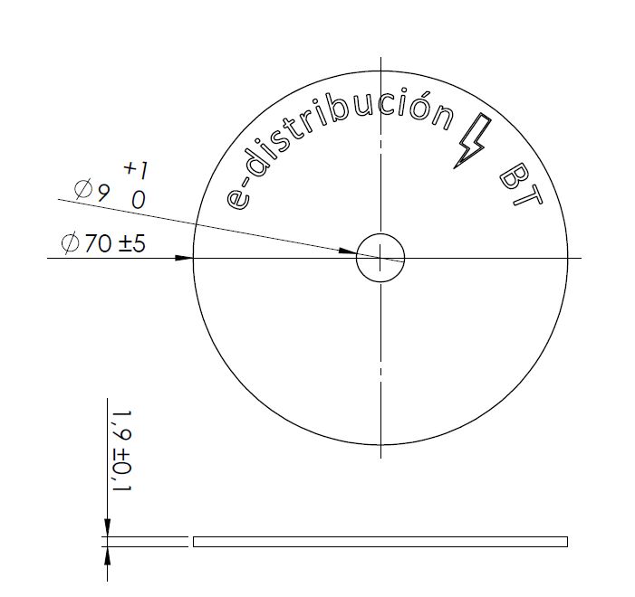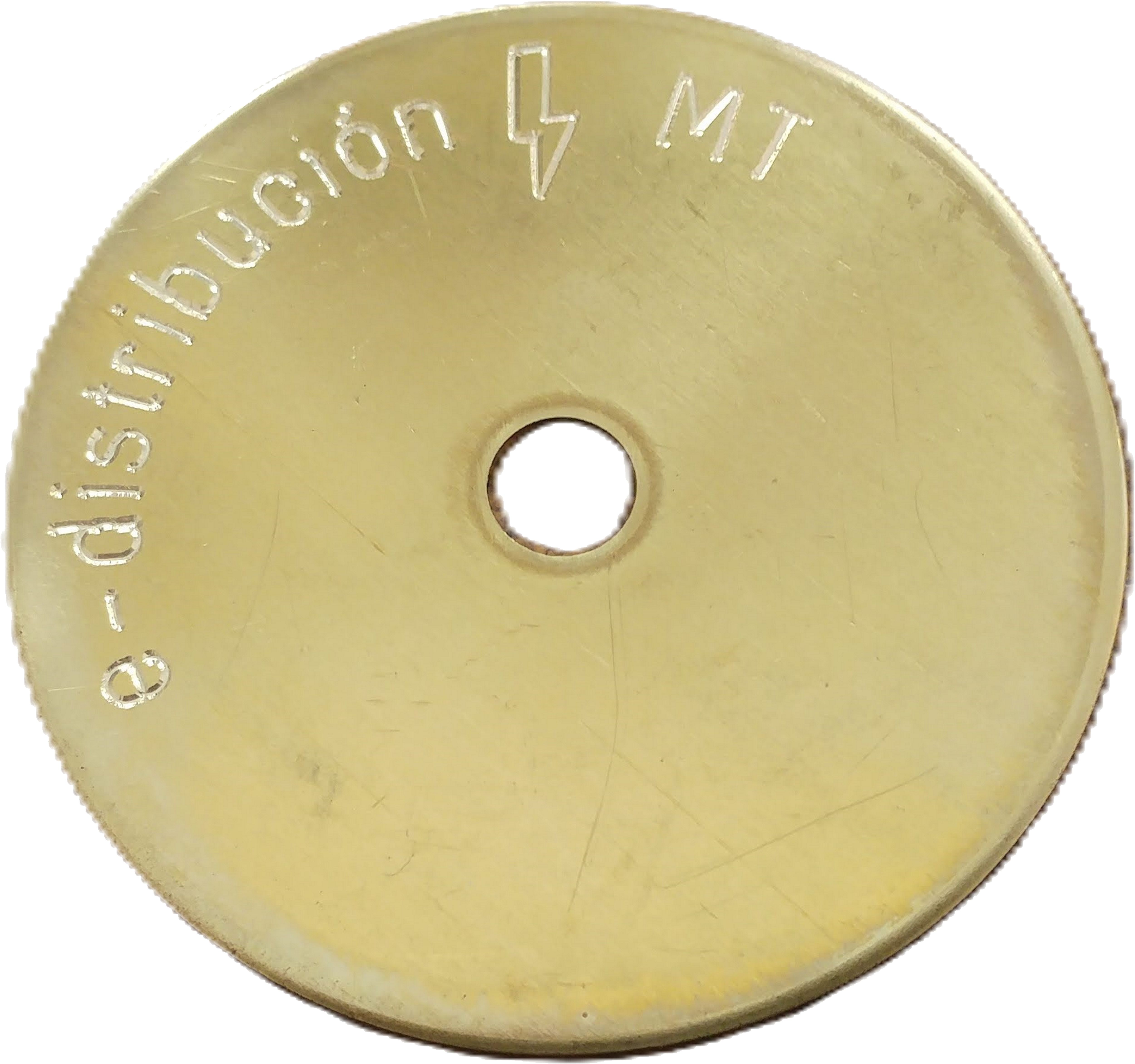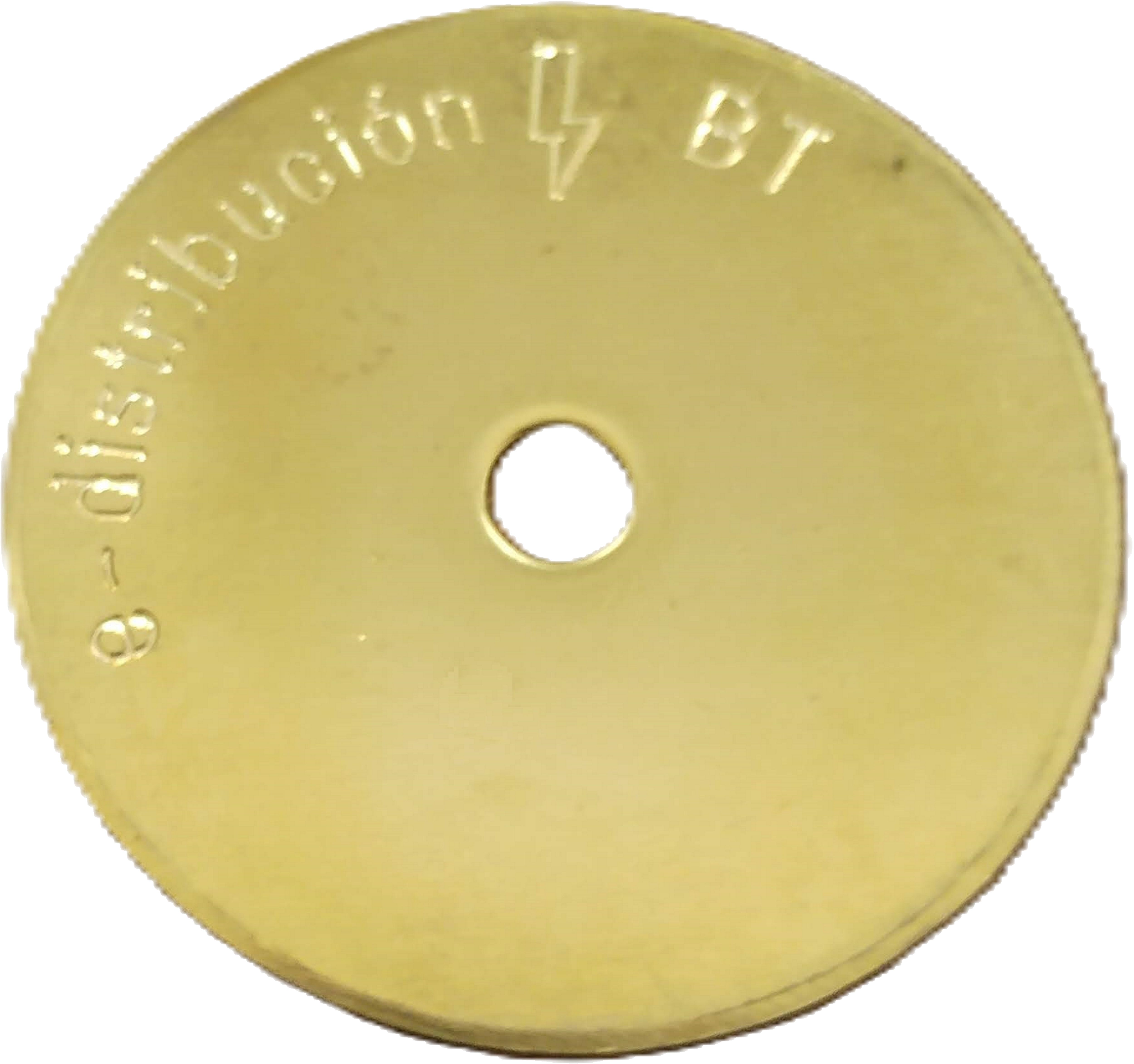 Arandela plana ⌀70mm en latón con grabado de texto personalizado. Disponible en dos variantes: BT (Baja Tensión) y MT (Media Tensión). Presentación en unidades sueltas. Máximo 25 caracteres de grabado con el logo "e-distribución".
