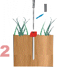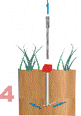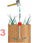 | Poner el mojón en el sitio requerido e introducir el anclaje. Para clavar el anclaje, meter el amarre con la arandela y picar la cabeza con la maza. | El anclaje debe quedar a nivel del mojón. Quitar del amarre la arandela. | Volver a introducir el amarre en el anclaje y golpear con la maza para que salgan los hierros, hasta que queden 3 o 4 cm sin hundir. | Sacar el amarre. El mojón ya esta colocado. |