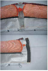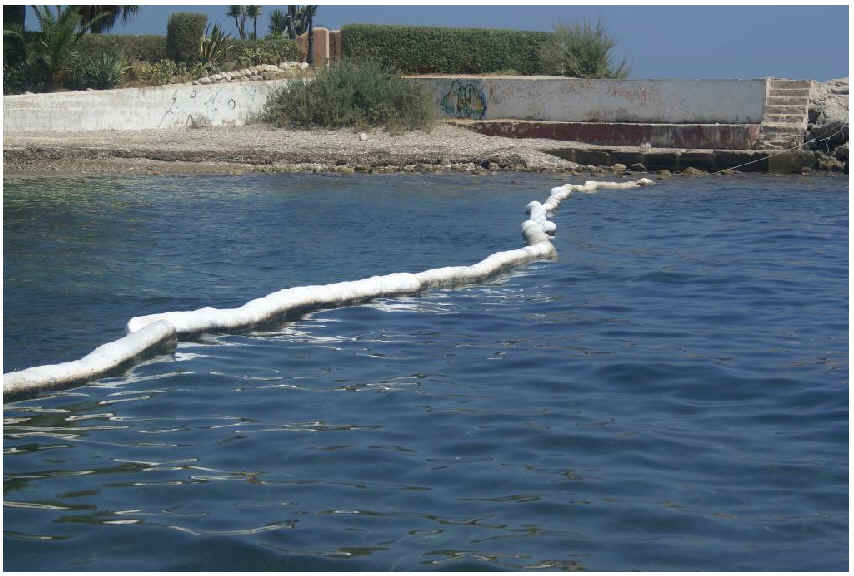 BARRERAS SIN FALDÓN Características Las barreras absorbentes sin faldón están compuestas por una funda exterior tipo “malla rachel ”,con un cabo de polipropileno pretensado como elemento de tensión, y sistema de conexión entre barreras compuesto por mosquetón y anilla metálica. Este sistema favorece la conexión de las barreras con otras barreras de características similares existentes. A su vez la anilla metálica actúa como punto de fondeo. El interior de la barrera, está relleno con MeltBlown de polipropileno 100% triturado. Lleva un tejido intermedio a modo de funda del materia absorbente que evita a perdida de fibras, a su vez es un elemento muy eficaz para contener la lixiviación de los fluidos que saturan a barrera. La conexión entre barreras es sencilla mediante los elementos de fijación, entrelazando las barreras entre si para evitar la fuga de hidrocarburos entre los tramos de conexión.