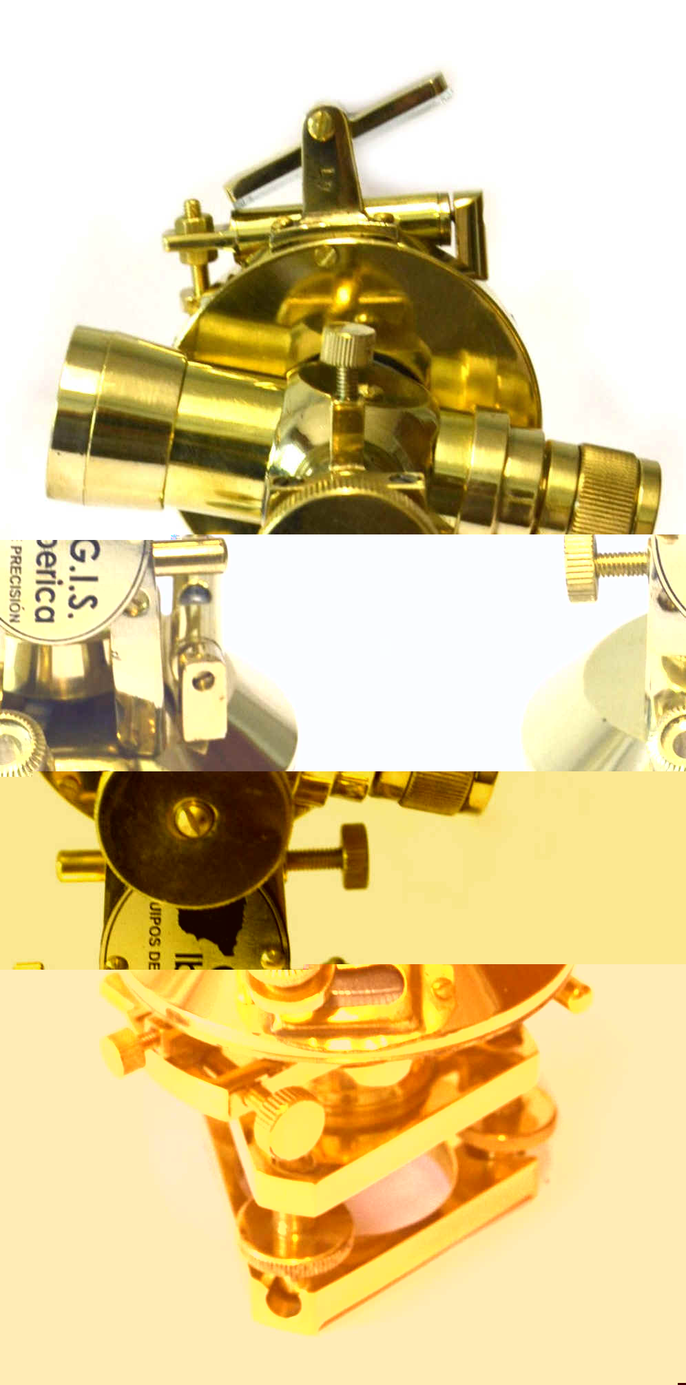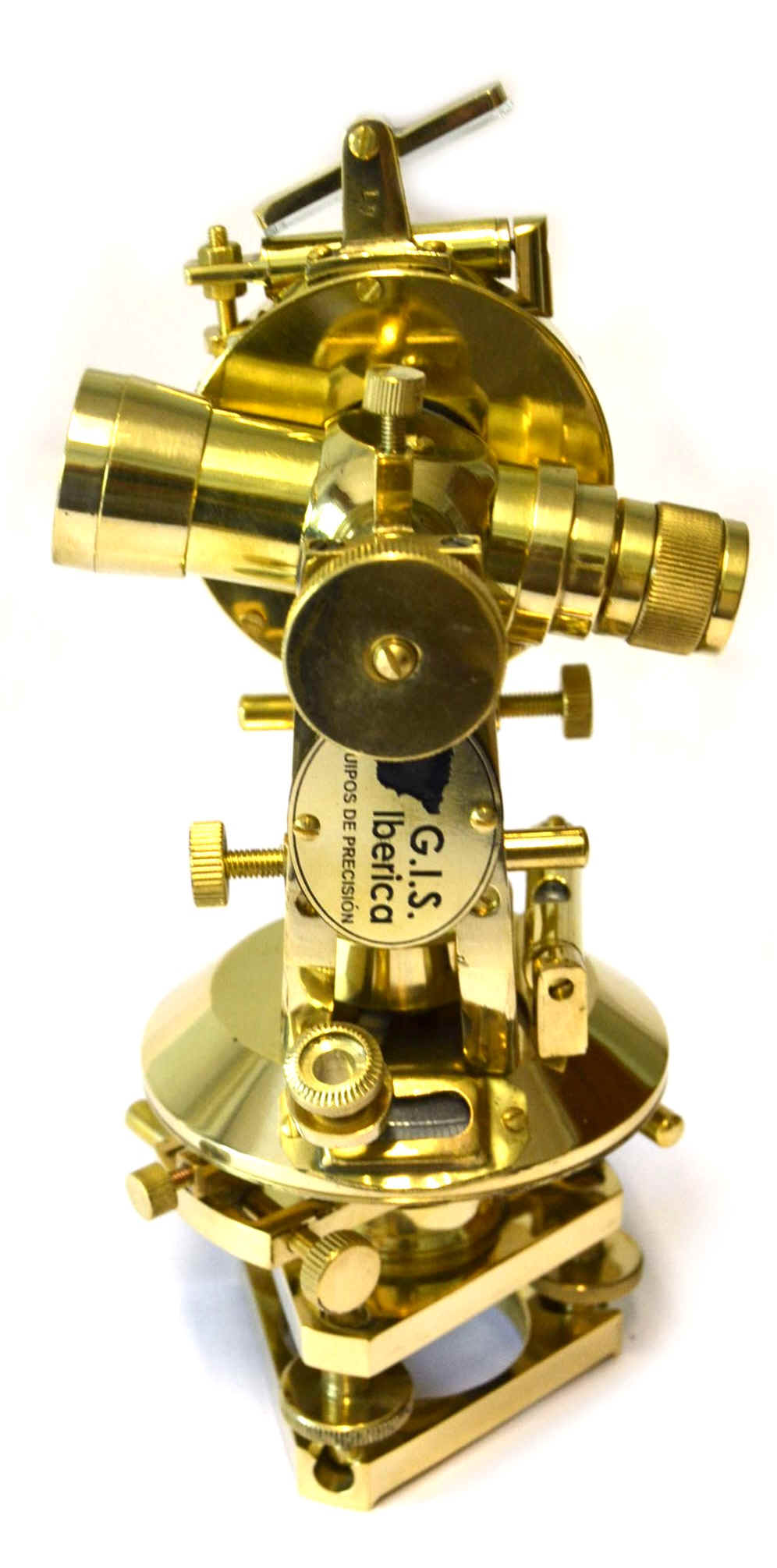 Reproducción de antiguo teodolito de bronce, totalmente operativo, dispone de plataforma nivelante con tres tornillos para una nivelación del nivel tórico que se encuentra lateral sobre la plataforma.